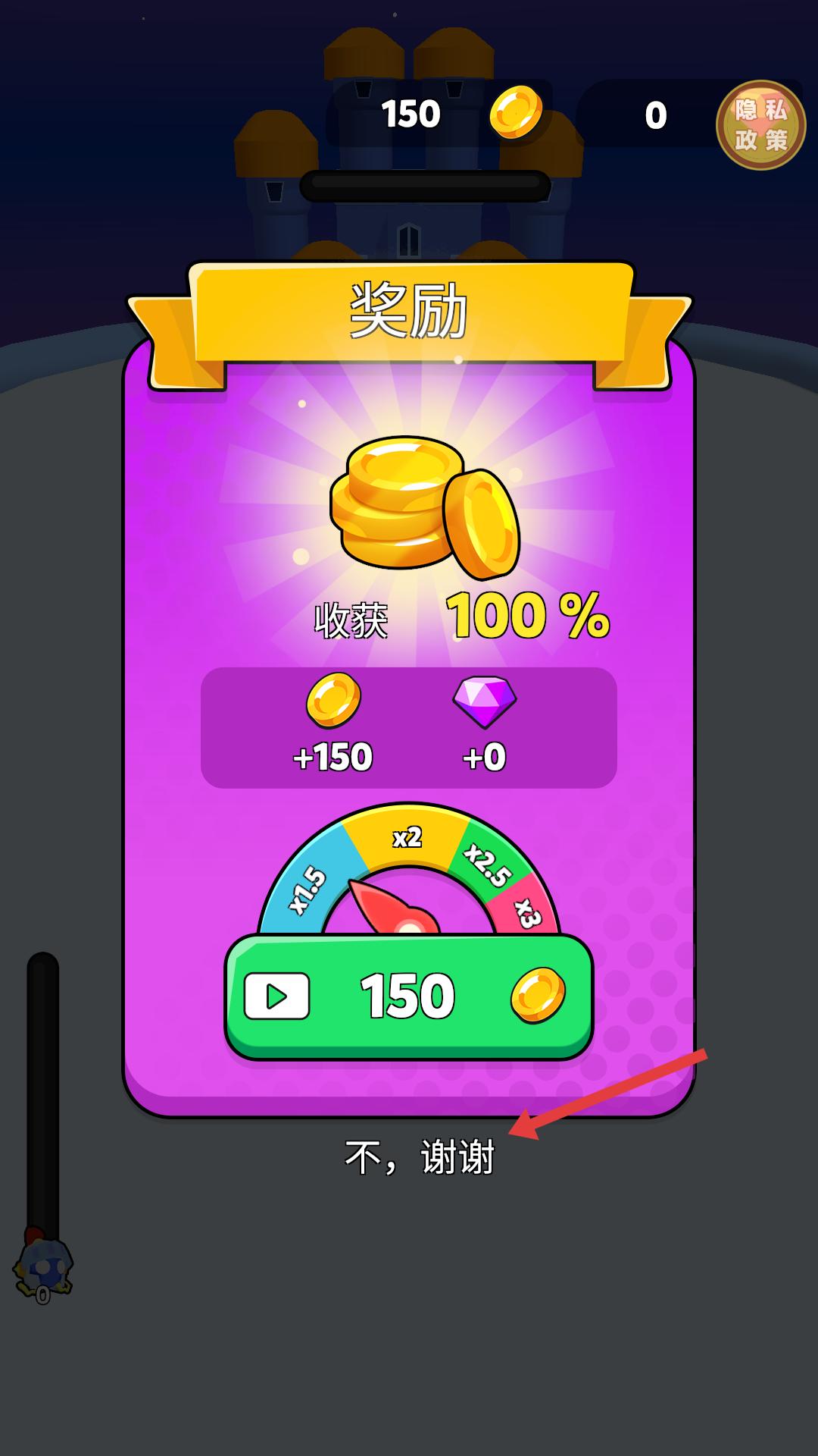 3、畫面出現(xiàn)獎(jiǎng)勵(lì)彈窗,若不想通過觀看視頻翻倍金幣,可點(diǎn)擊不,謝謝,直接領(lǐng)取基礎(chǔ)的150金幣獎(jiǎng)勵(lì)。