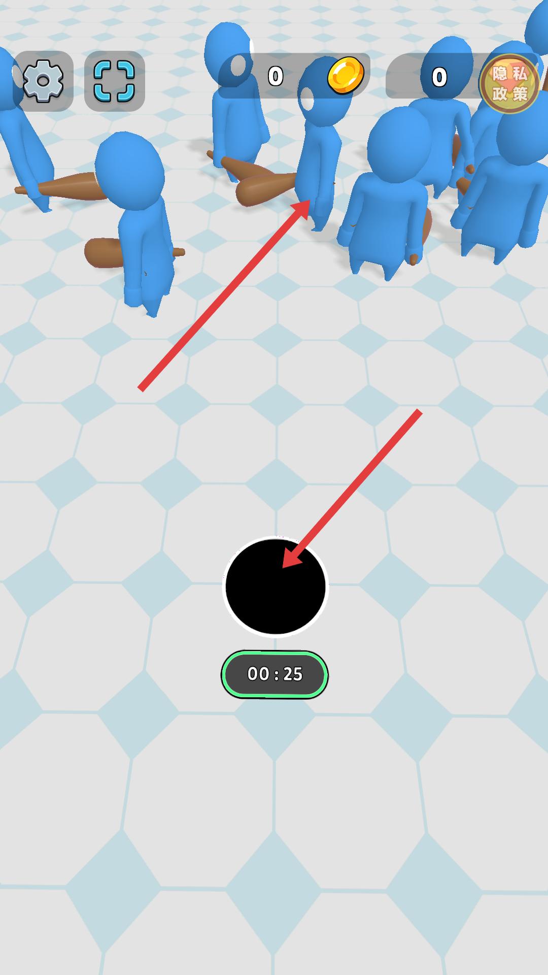 1、觀察畫面中藍(lán)色小人與黑色圓圈的位置關(guān)系,利用紅色箭頭指引的方向,操控角色向目標(biāo)移動(dòng),嘗試吞噬藍(lán)色小人。
