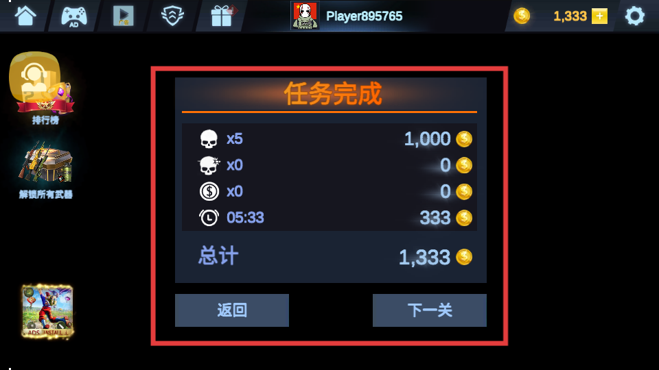 4、成功完成任務(wù)后,會(huì)顯示任務(wù)完成界面,可獲取金幣獎(jiǎng)勵(lì),之后可選擇返回或下一關(guān),玩家可以繼續(xù)游戲挑戰(zhàn)。