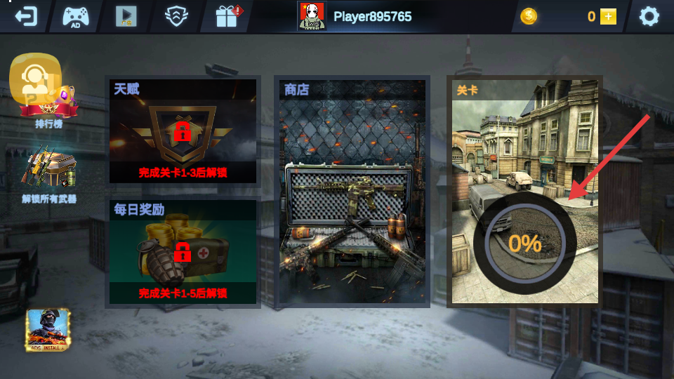 1、玩家進(jìn)入游戲界面,點(diǎn)擊關(guān)卡區(qū)域開(kāi)始游戲,此時(shí)天賦、每日獎(jiǎng)勵(lì)等功能暫未解鎖,需先完成關(guān)卡推進(jìn)解鎖。