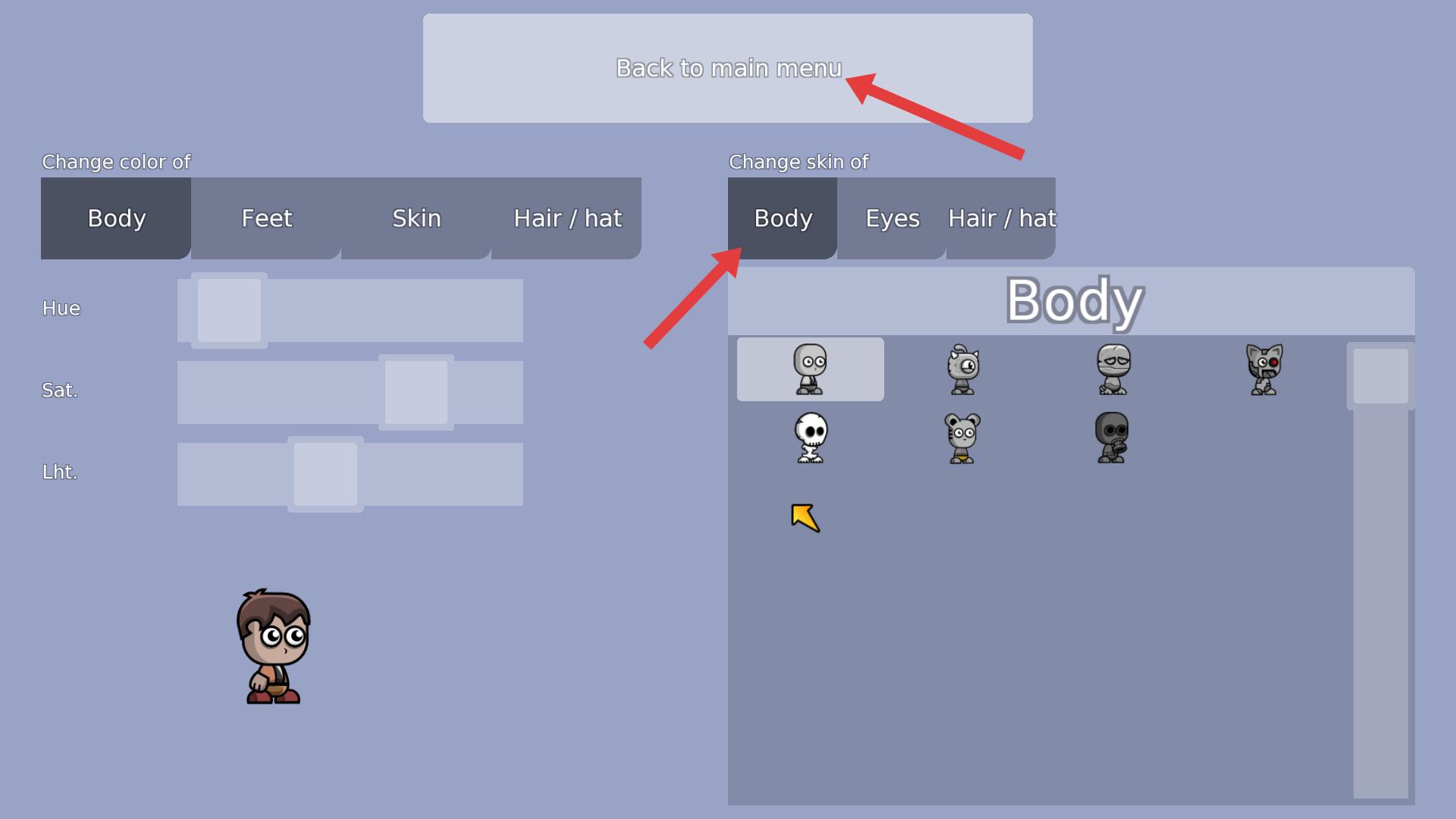 2、角色自定義界面,可在改變膚色種類下選擇Body,挑選不同身體皮膚,打造獨特角色外觀,還能通過上方按鈕返回主菜單。