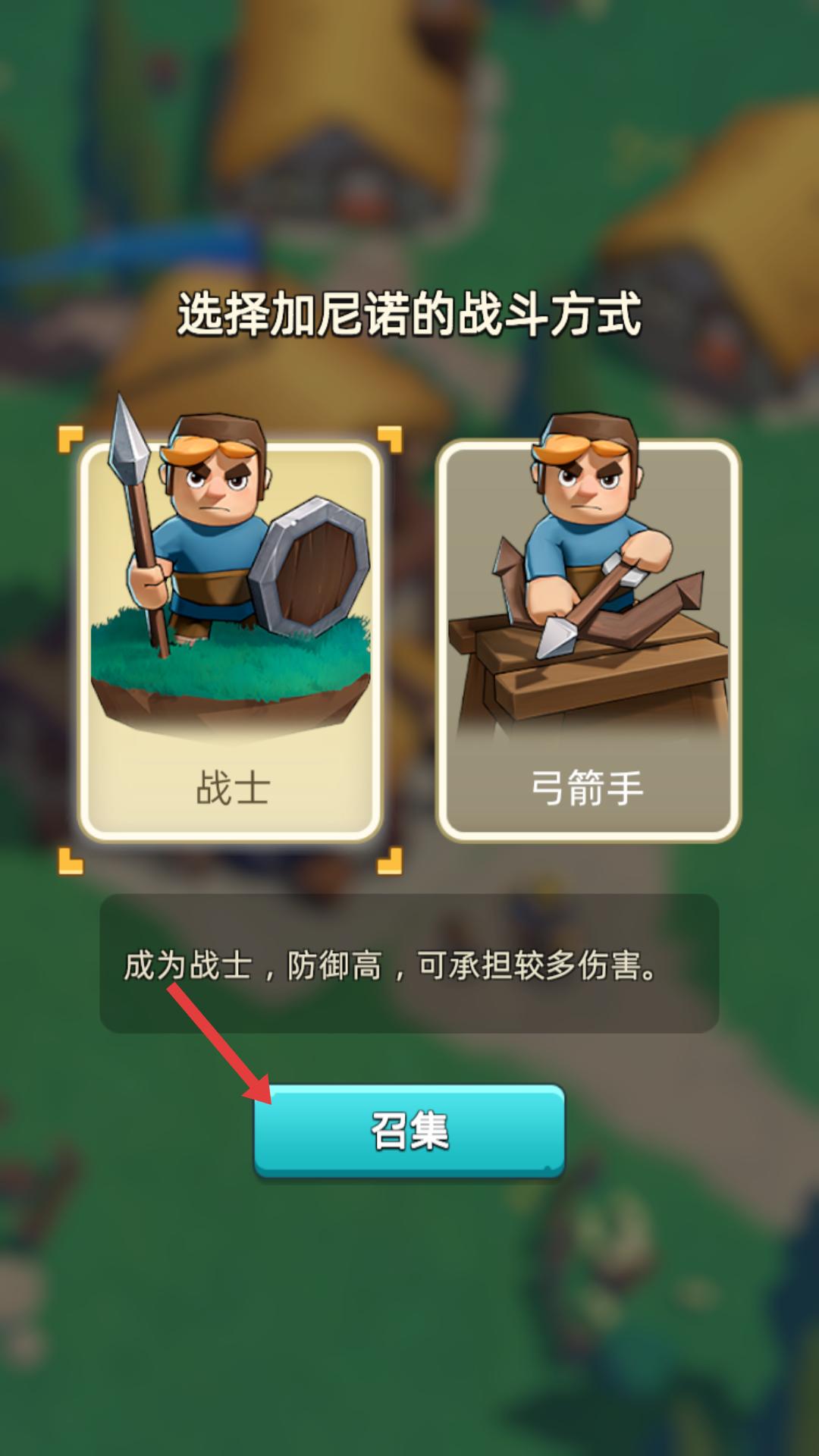 1、可選擇加尼諾的戰(zhàn)斗方式,戰(zhàn)士防御高,能承擔較多傷害,選好后點擊召集,即可開啟戰(zhàn)斗。