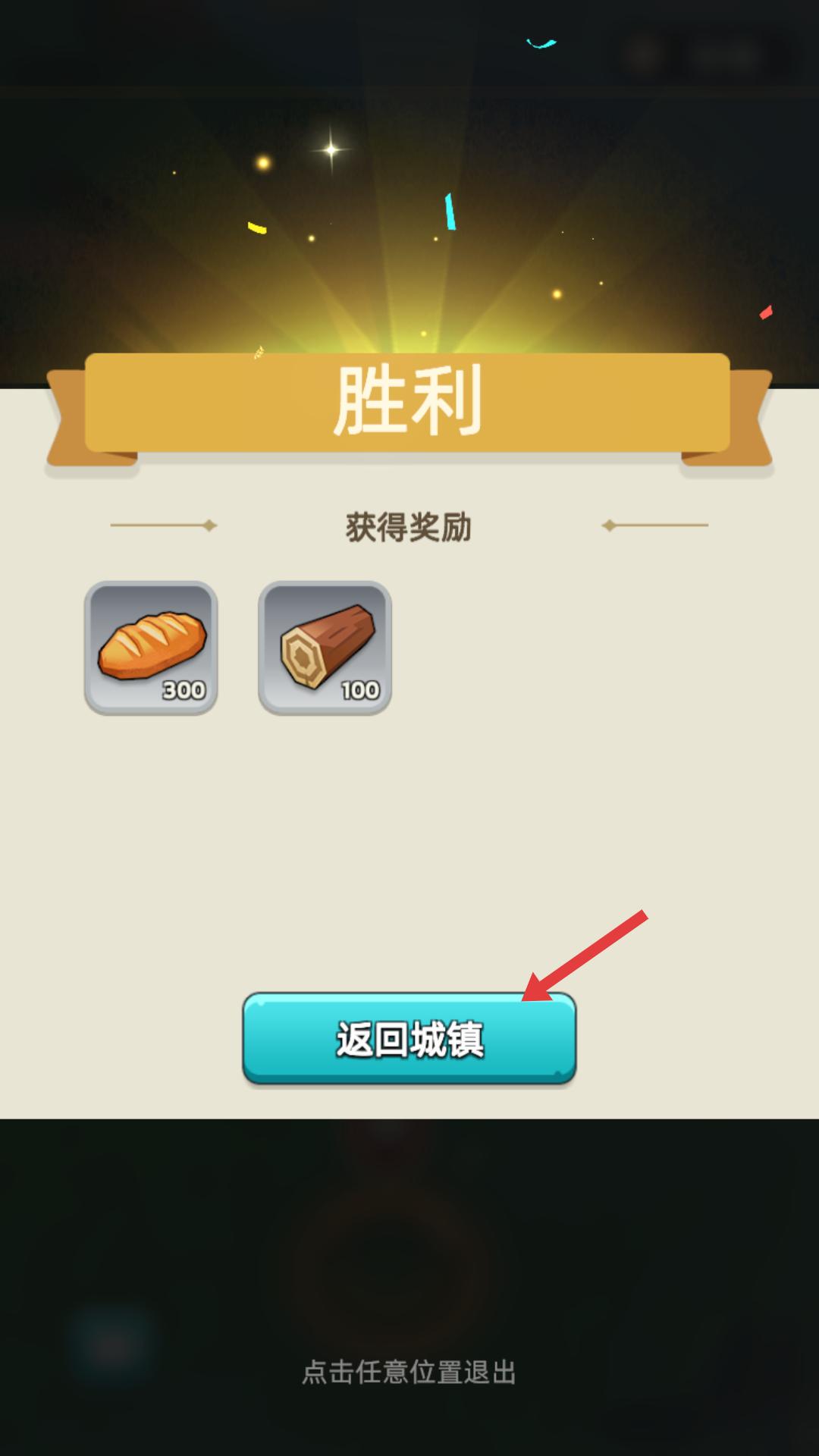 4、成功擊敗敵人,取得勝利后,界面會顯示獲得的獎勵,點擊返回城鎮(zhèn),即可回到城鎮(zhèn),準備下一次戰(zhàn)斗。