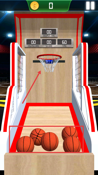 2、玩家進(jìn)入游戲界面后,屏幕下方會(huì)出現(xiàn)多個(gè)籃球,滑動(dòng)屏幕或者點(diǎn)擊籃球,將籃球投向籃筐。