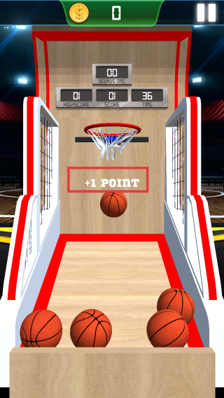 3、玩家投進(jìn)一個(gè)球,游戲就會(huì)顯示加1Point的標(biāo)志,玩家的得分會(huì)累計(jì)在屏幕上方的SCORE處。