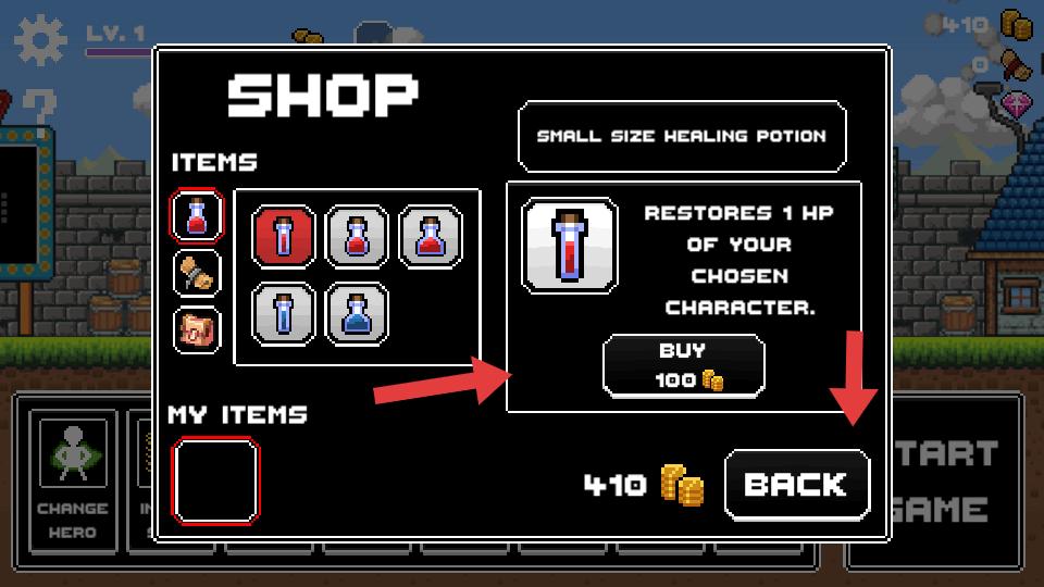 3、在商店界面,選定道具查看效果,點(diǎn)擊BUY消耗金幣購(gòu)買,采購(gòu)?fù)挈c(diǎn)BACK退出商店。