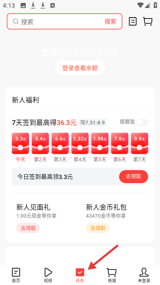 2、任務(wù)中心界面,主打新人福利,7天簽到設(shè)豐厚獎勵,另有見面禮與金幣禮包,吸引用戶參與。