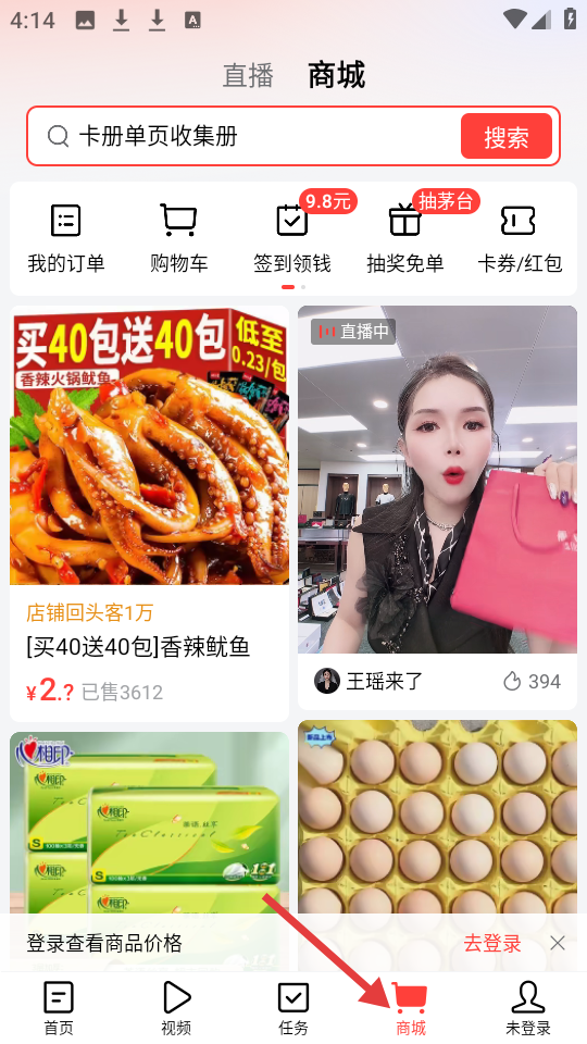 3、商城板塊,直播與商品展示結(jié)合,有香辣魷魚等貨品,涵蓋訂單管理等功能,部分操作需登錄。