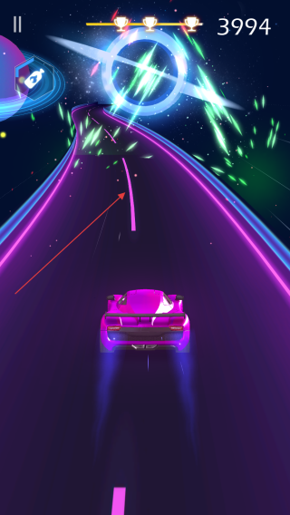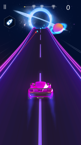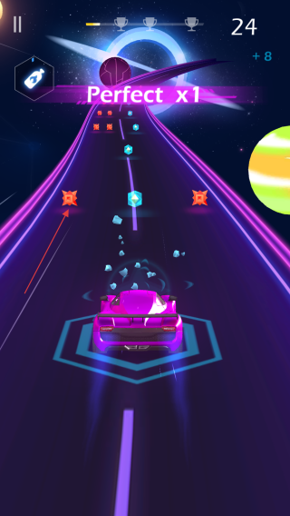 3、音樂節(jié)拍同步:背景音樂BPM與賽道障礙物生成節(jié)奏聯(lián)動,踩準節(jié)拍通過特定區(qū)域可獲得完美判定獎勵,打造音游般的韻律競速體驗。