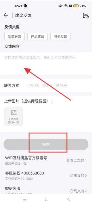 4、若有其他建議或問題,進入建議反饋頁面,選擇反饋類型如功能異常、產(chǎn)品建議等,填寫反饋內(nèi)容,留下聯(lián)系方式等待客服處理。