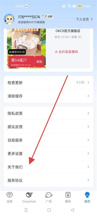 1、進入我的頁面點擊關于我們選項,進入WiFi萬能鑰匙客服頁面,查看客服熱線和工作時間,了解焦點問題列表。