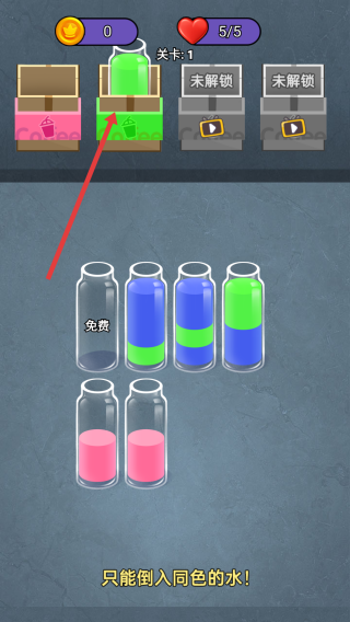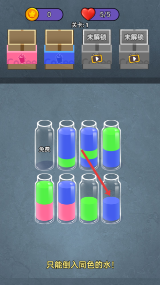 2、倒水時要注意規(guī)則,只能將液體倒入同色的容器中,仔細(xì)分辨顏色,把液體準(zhǔn)確倒入對應(yīng)顏色的瓶子里。