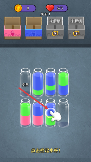 1、進(jìn)入游戲關(guān)卡,看到多個裝有不同顏色液體的瓶子,按照提示點擊拾起裝有液體的水杯,準(zhǔn)備進(jìn)行倒水操作。