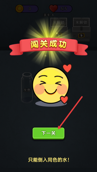 4、當(dāng)所有液體都完成同色分類后,就會顯示闖關(guān)成功,此時可點擊下一關(guān),繼續(xù)挑戰(zhàn)新的關(guān)卡。
