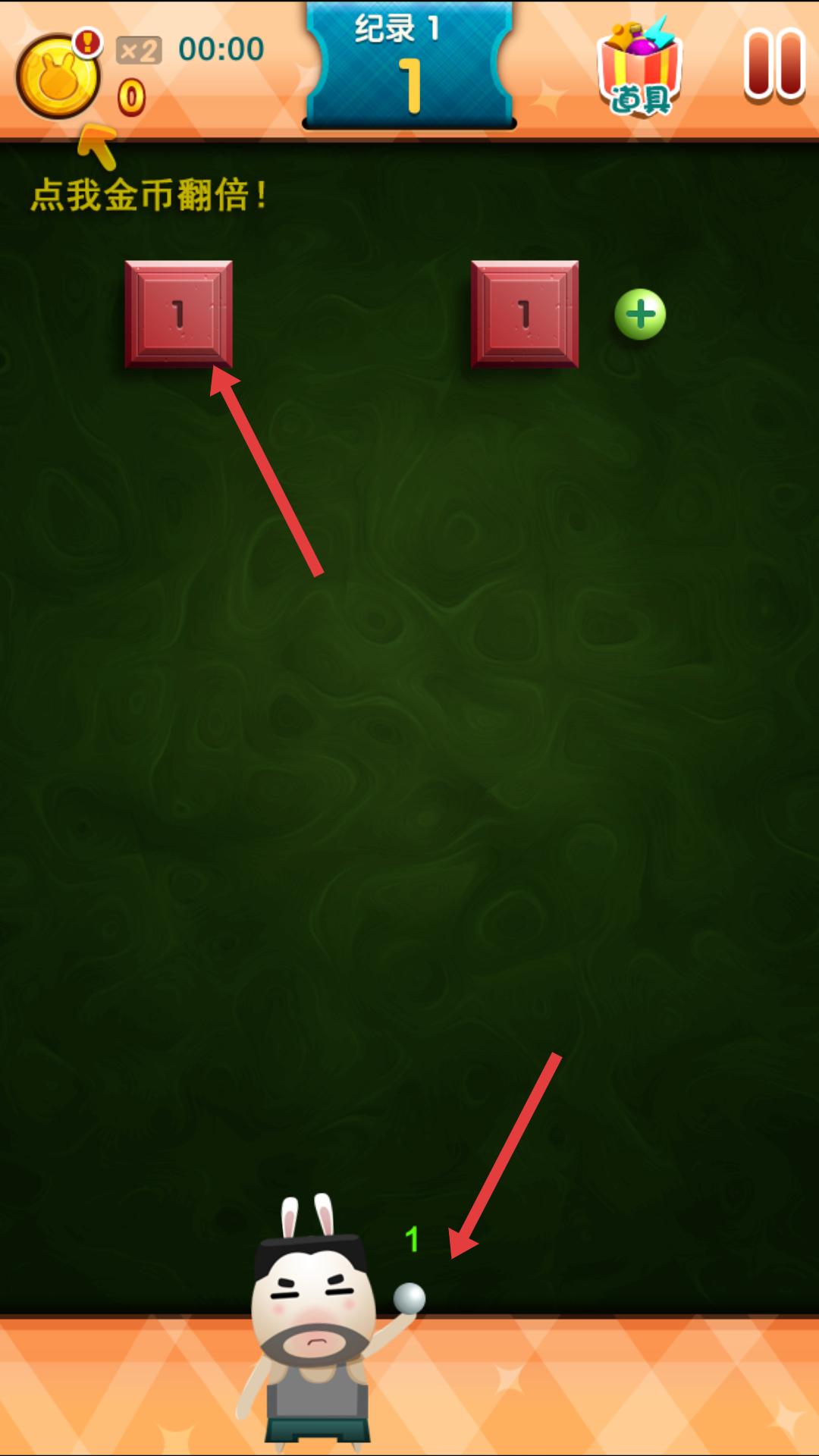 1、游戲初始界面有紅色方塊和角色,上方有金幣、紀(jì)錄等顯示,點(diǎn)擊屏幕,操控角色發(fā)射小球,瞄準(zhǔn)紅色方塊,開始消除挑戰(zhàn)。