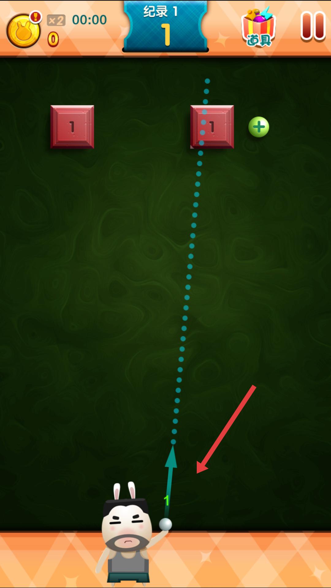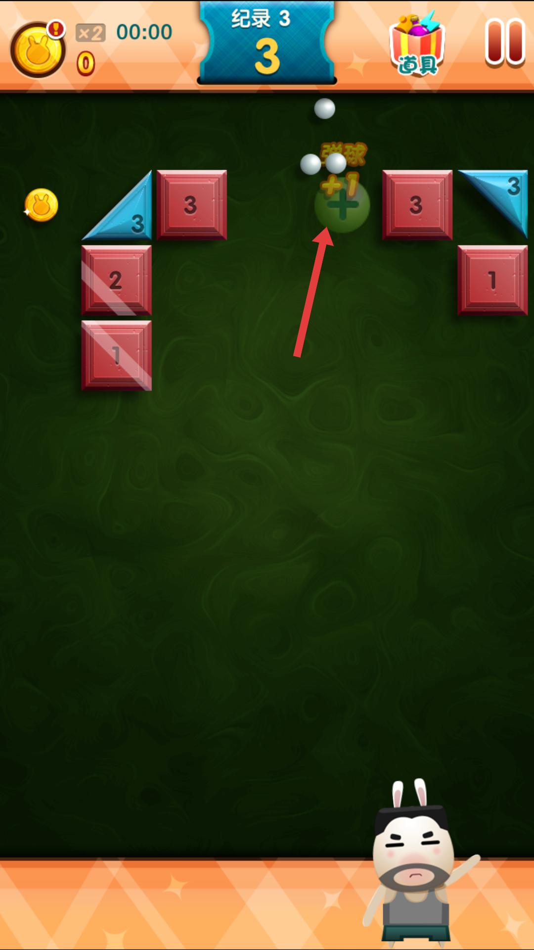 3、后續(xù)界面出現(xiàn)帶數(shù)字的方塊和綠色的加球道具,瞄準(zhǔn)綠色道具,讓小球擊中它,增加小球數(shù)量,更高效地消除方塊,獲取更高分?jǐn)?shù)。