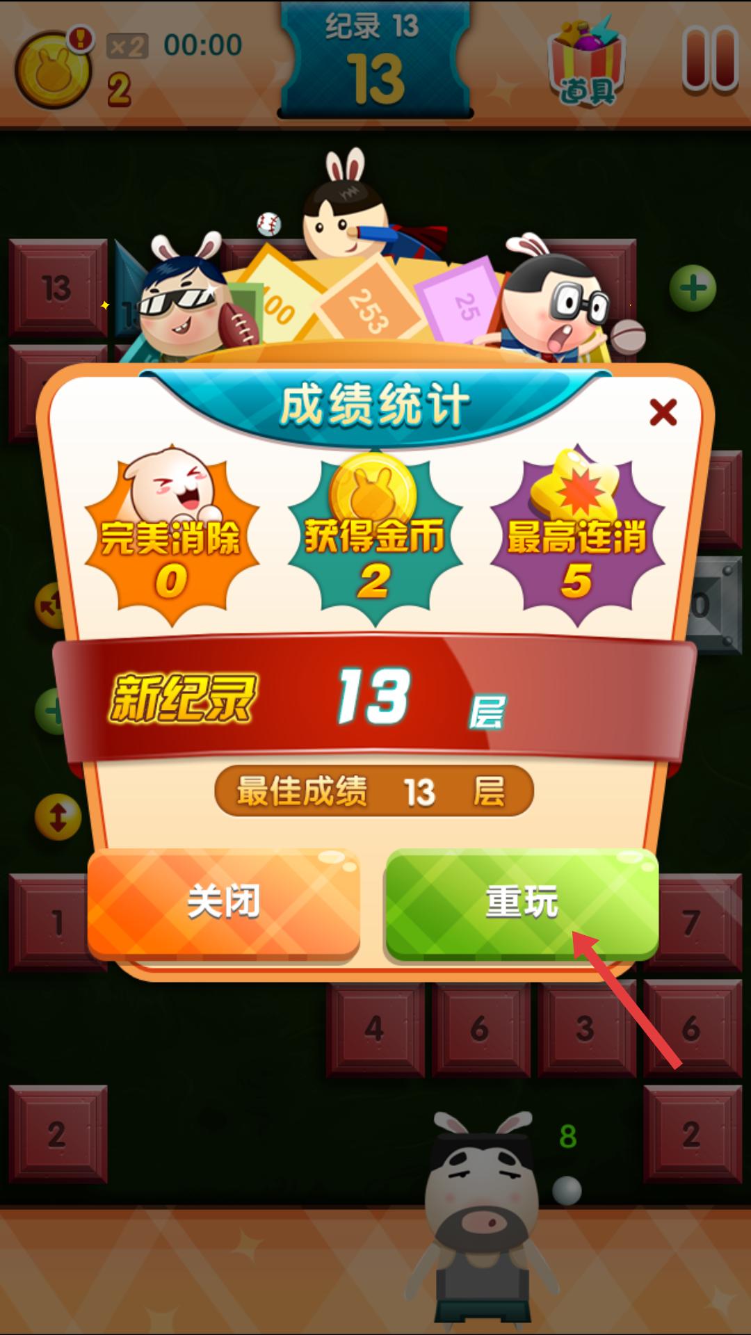 4、游戲結(jié)束后,界面顯示成績統(tǒng)計(jì),若想再次挑戰(zhàn),點(diǎn)擊重玩按鈕,重新開始游戲,嘗試突破之前的紀(jì)錄,繼續(xù)消除方塊冒險(xiǎn)。