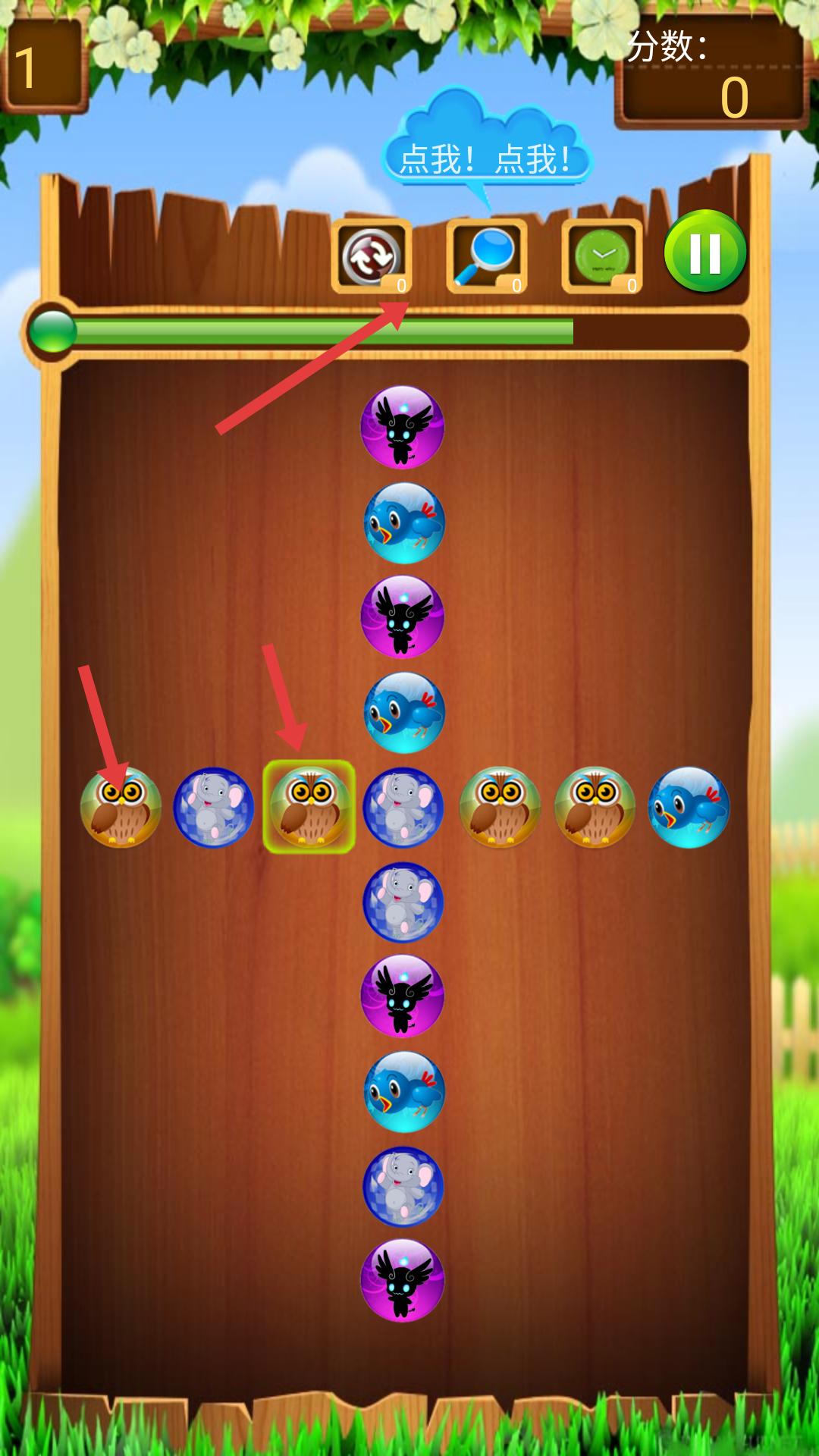 3、進(jìn)入第一關(guān)后,界面有不同圖案的圖標(biāo),根據(jù)提示點(diǎn)擊相同圖案的圖標(biāo)進(jìn)行消除,同時(shí)可利用上方功能按鈕輔助,積累分?jǐn)?shù)推進(jìn)游戲。