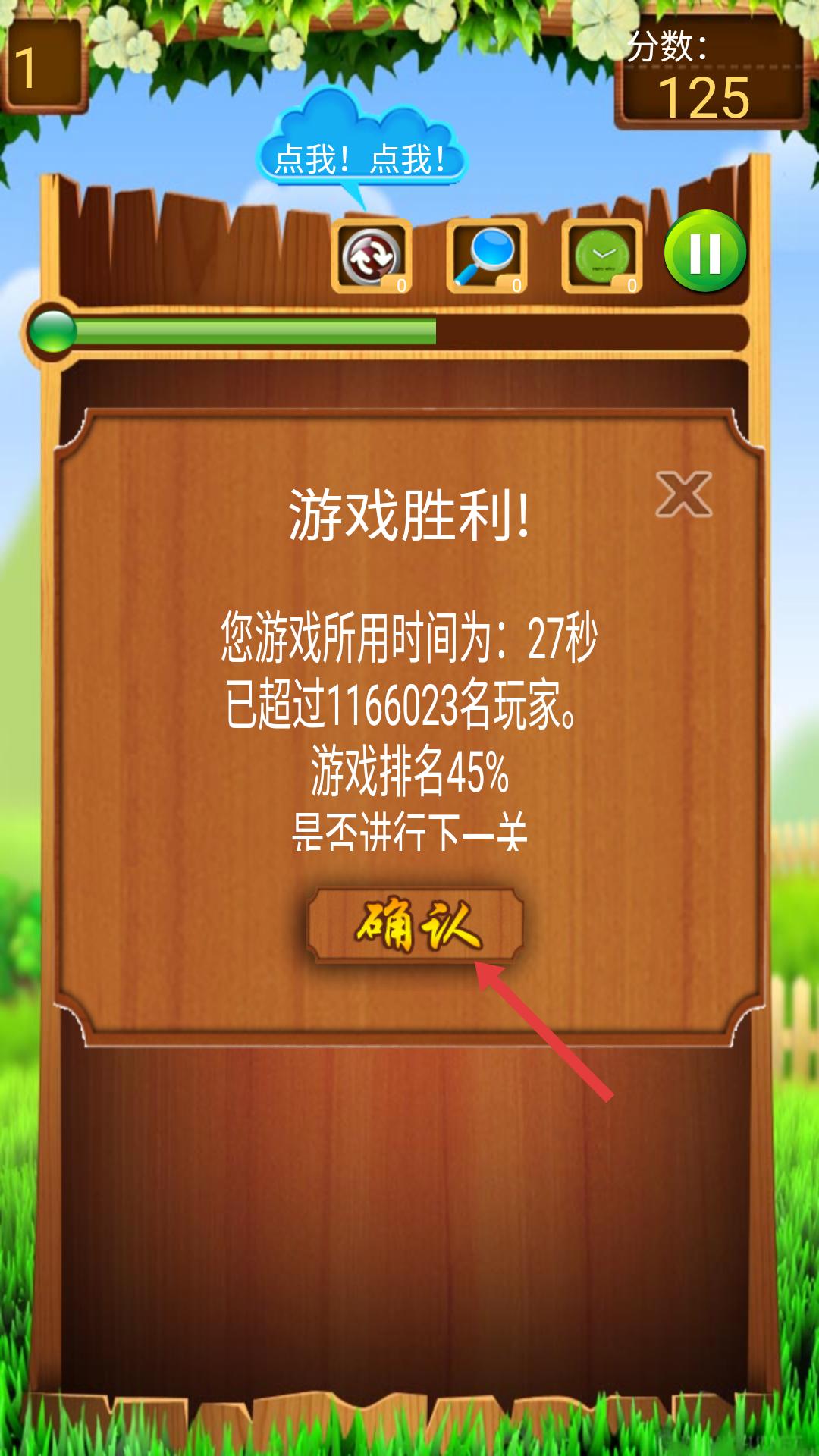 4、成功通關(guān)后,界面顯示游戲勝利及相關(guān)數(shù)據(jù),點(diǎn)擊確認(rèn)按鈕,可選擇進(jìn)行下一關(guān),繼續(xù)消除游戲的冒險(xiǎn)。