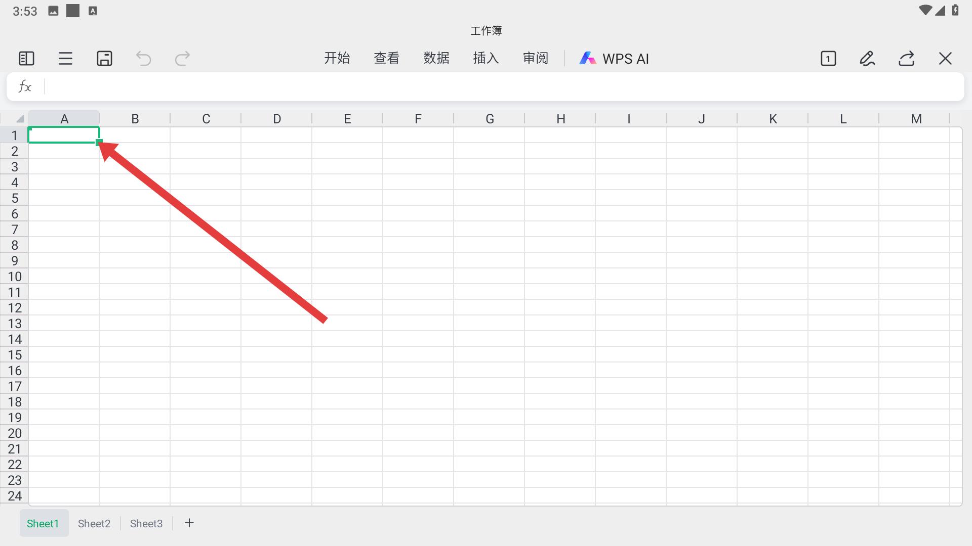 4、進(jìn)入空白表格編輯界面,可看到表格的行列布局,上方有開始、查看等功能選項卡,可在單元格中輸入數(shù)據(jù)、進(jìn)行表格編輯等操作。