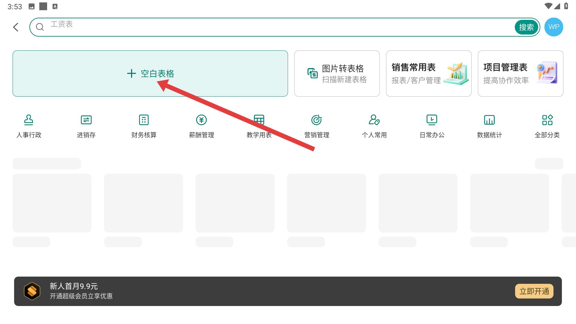 3、進(jìn)入表格創(chuàng)建頁面,有空白表格、圖片轉(zhuǎn)表格等選項,若要創(chuàng)建空白表格,點擊空白表格選項。