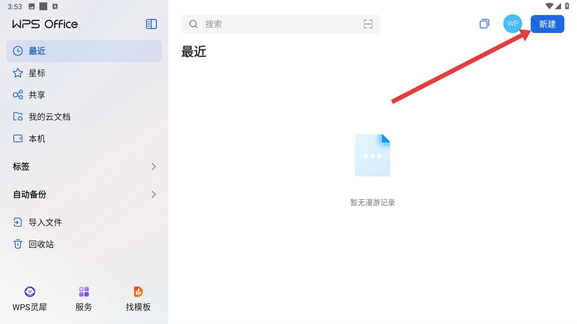 1、進(jìn)入WPS Office主界面,能看到最近文檔等內(nèi)容,若要新建文檔,點擊右上角新建按鈕。