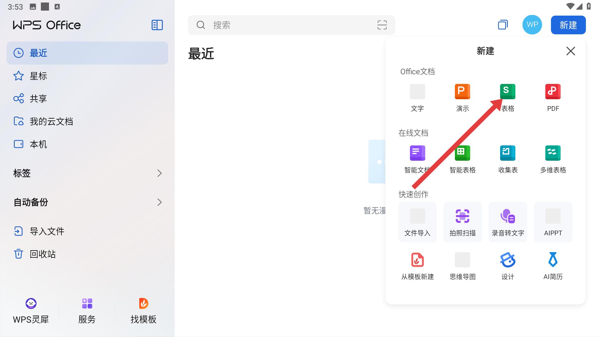 2、點擊新建后,會彈出新建選項界面,有文字、演示、表格等Office文檔類型,若要新建表格,點擊表格選項。