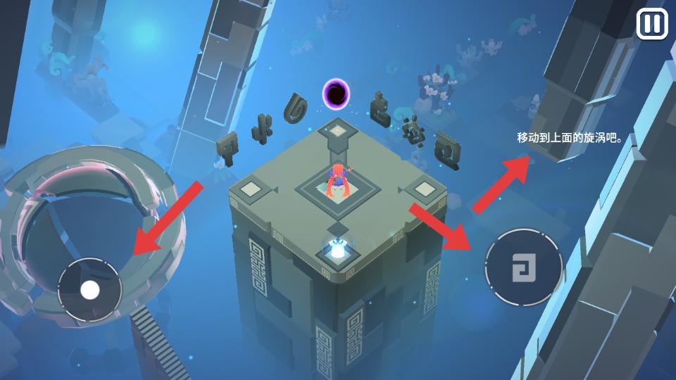 2、進(jìn)入場景后,通過左側(cè)虛擬搖桿控制角色移動(dòng)方向,配合右側(cè)功能按鈕,按提示前往上方漩渦。
