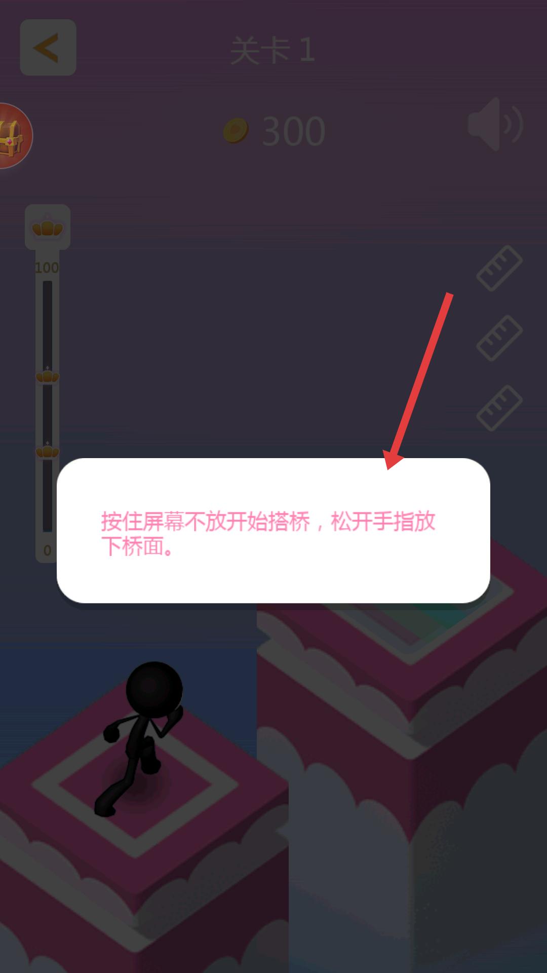 2、進(jìn)入關(guān)卡1,界面提示按住屏幕不放開始搭橋,松開手指放下橋面,按照提示操作,為火柴人搭建通往對(duì)面平臺(tái)的橋。