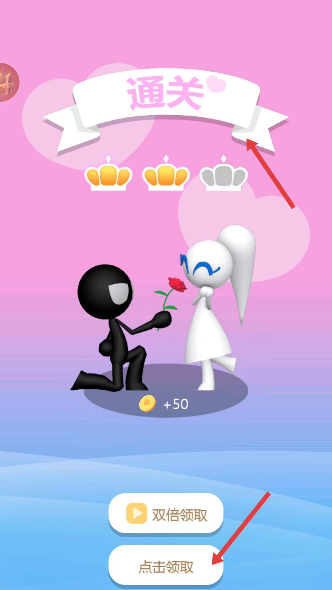 4、到達(dá)終點(diǎn)界面顯示通關(guān),可選擇點(diǎn)擊領(lǐng)取獲取金幣獎(jiǎng)勵(lì),也可選擇雙倍領(lǐng)取觀看廣告獲得更多獎(jiǎng)勵(lì),領(lǐng)取后可繼續(xù)挑戰(zhàn)后續(xù)關(guān)卡。