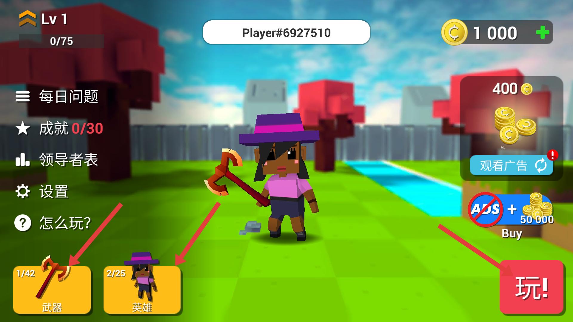 1、游戲初始界面,可查看武器、英雄等內(nèi)容,若想開始游戲,點(diǎn)擊右側(cè)玩按鈕,即可進(jìn)入游戲,開啟冒險(xiǎn)之旅。