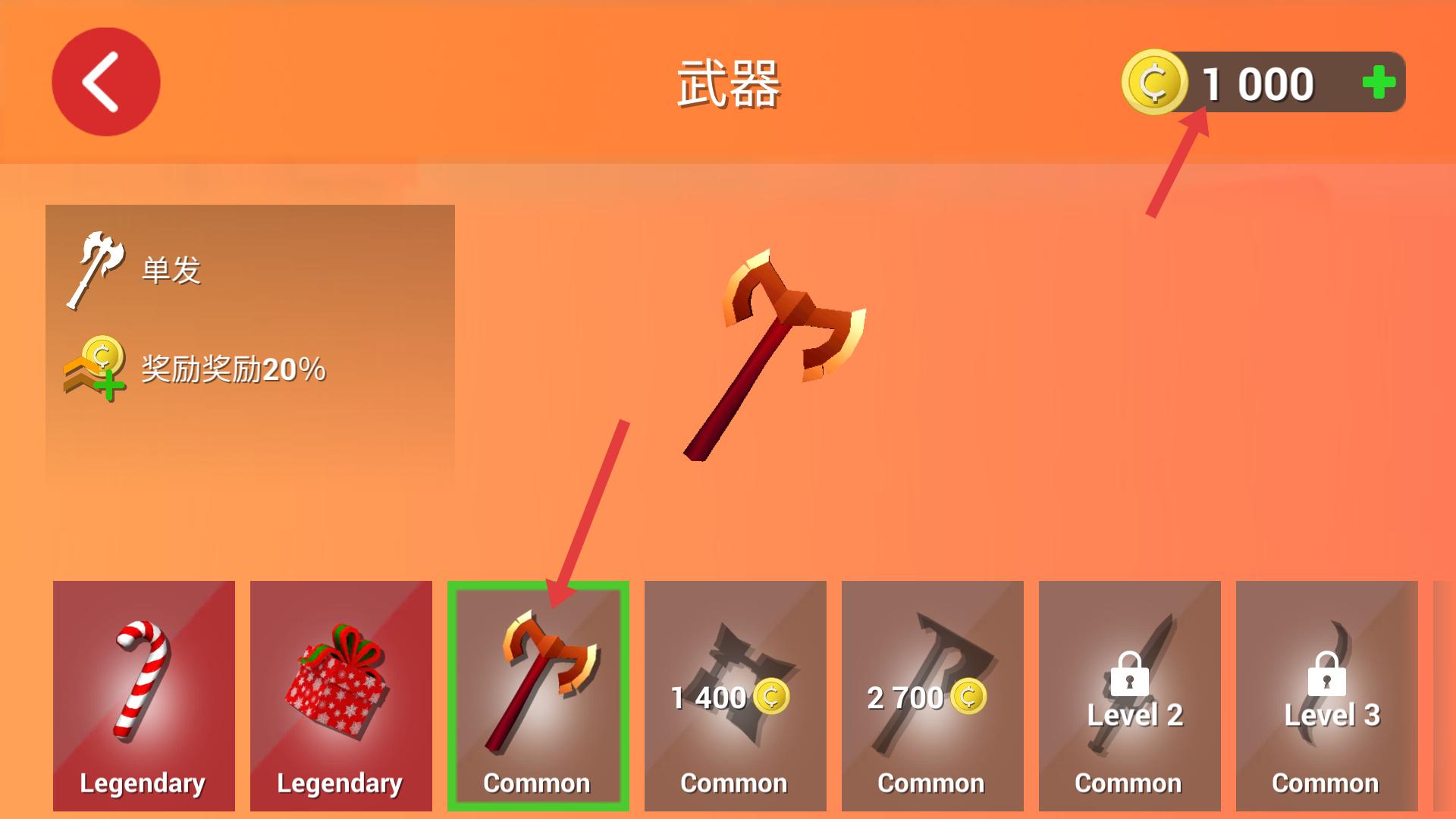 2、武器界面能看到不同類型的武器,可使用金幣購買或解鎖新武器,選擇合適的武器,能提升游戲中的戰(zhàn)斗能力。