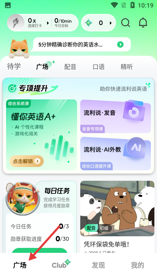 1、流利說(shuō)英語(yǔ)APP首頁(yè),含打卡與今日目標(biāo)區(qū)設(shè)待學(xué)廣場(chǎng)等欄目,專項(xiàng)提升推個(gè)性化英語(yǔ)課。