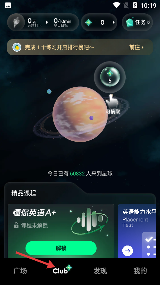2、Club界面以星球?yàn)橹黝},展示任務(wù)進(jìn)度,提示開(kāi)啟排行榜,并有懂你英語(yǔ)A等課程待解鎖。