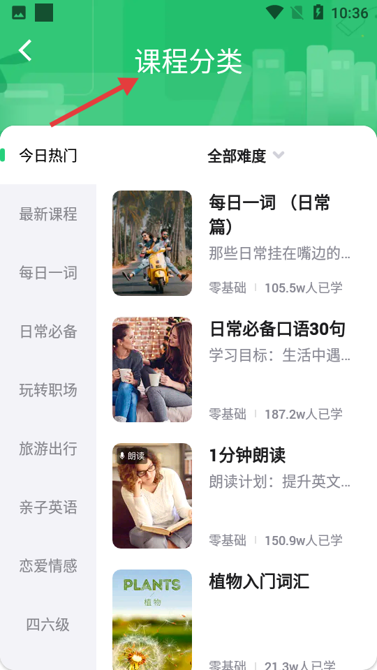 1、課程分類頁面有今日熱門最新課程等分類,展示每日一詞、日常必備口語等課程,標(biāo)明難度與學(xué)習(xí)人數(shù)。