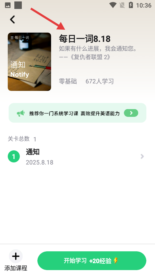 2、每日一詞8.18課程頁面引用復(fù)仇者聯(lián)盟2臺(tái)詞,為零基礎(chǔ)課程,提示可添加課程、開始學(xué)習(xí)。