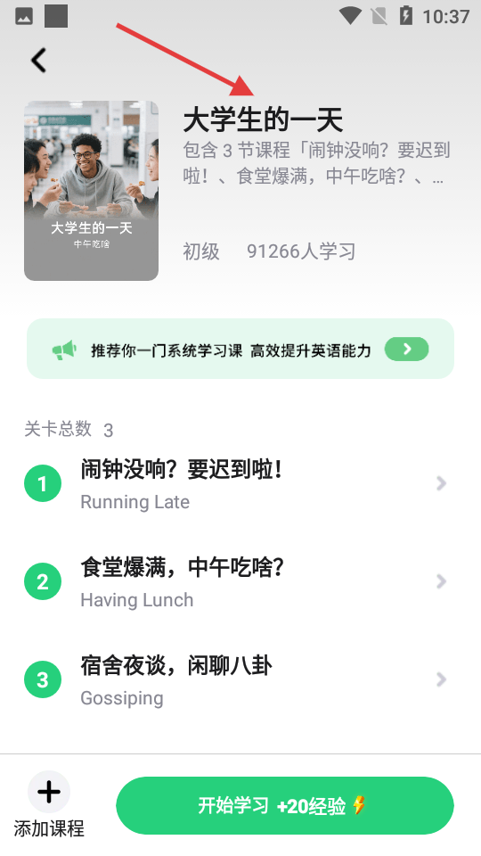 3、大學(xué)生的一天課程頁面,含3節(jié)內(nèi)容如鬧鐘沒響、食堂吃飯等場景,顯示課程難度與學(xué)習(xí)人數(shù)。