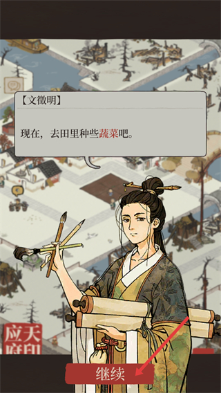 2、角色會(huì)提示去田里種蔬菜,點(diǎn)擊繼續(xù),推進(jìn)游戲流程,按照指引開展種植蔬菜的相關(guān)操作。