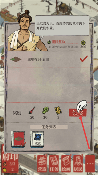 1、完成建造農(nóng)田等任務(wù)后,可點(diǎn)擊領(lǐng)獎(jiǎng),獲取獎(jiǎng)勵(lì),這些獎(jiǎng)勵(lì)能用于城市后續(xù)的建設(shè)和發(fā)展,助力城市繁榮。