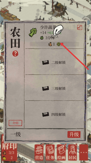 3、進(jìn)入農(nóng)田界面,可選擇種植少許蔬菜,了解種植所需時(shí)間和收獲的資源,然后進(jìn)行種植,獲取蔬菜資源。