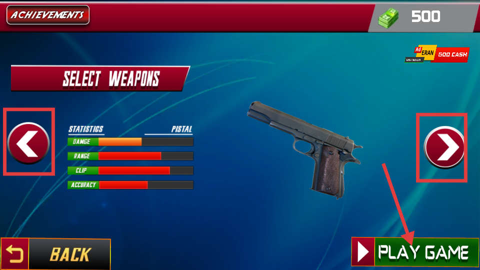 2、進(jìn)入武器選擇界面,可通過(guò)左右箭頭切換武器,這里展示的是手槍,查看其傷害、射程等屬性后,點(diǎn)擊PLAY GAME進(jìn)入戰(zhàn)斗。