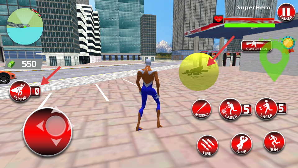 3、進(jìn)入城市場(chǎng)景后,看到圈出的目標(biāo)即物資,可以增加左側(cè)FLYING技能圖標(biāo)飛行次數(shù),玩家要積極探索周圍環(huán)境獲取更多物資。