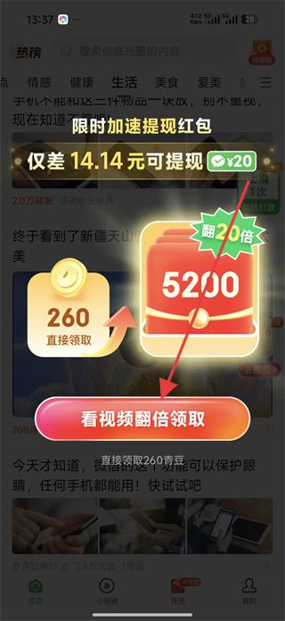 4、若想加速提現(xiàn)可參與限時(shí)加速提現(xiàn)紅包活動(dòng),點(diǎn)擊看視頻翻倍領(lǐng)取按鈕,觀看視頻后領(lǐng)取翻倍紅包,積累金額,滿足提現(xiàn)條件后進(jìn)行提現(xiàn)操作。