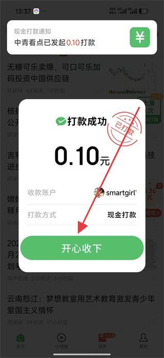 2、完成閱讀任務(wù)后會(huì)收到現(xiàn)金打款通知,如0.10元打款成功,點(diǎn)擊開心收下按鈕,領(lǐng)取現(xiàn)金獎(jiǎng)勵(lì)。