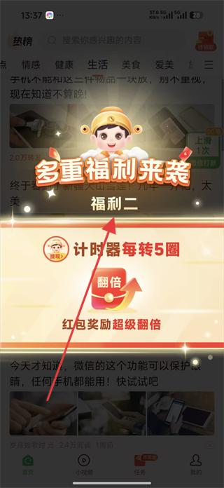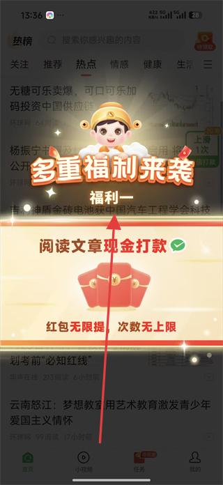 1、可看到多重福利來襲的提示,福利一為閱讀文章現(xiàn)金打款,紅包無限提、次數(shù)無上限,參與閱讀活動(dòng)獲取現(xiàn)金獎(jiǎng)勵(lì)。