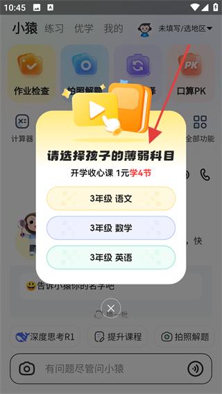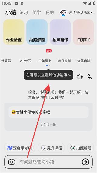 1、可看到作業(yè)檢查、拍照解題等功能入口,左滑能查看其他功能,還能與小猿互動(dòng),輸入名字等信息,開啟使用體驗(yàn)。