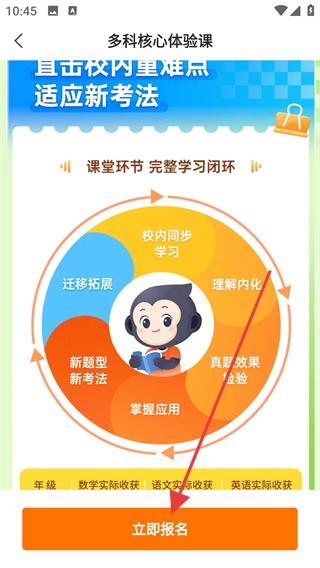 4、選擇年級(jí)后進(jìn)入課程詳情頁面,可看到課堂環(huán)節(jié)等完整學(xué)習(xí)閉環(huán)介紹,點(diǎn)擊立即報(bào)名,即可參與多科核心體驗(yàn)課的學(xué)習(xí)。