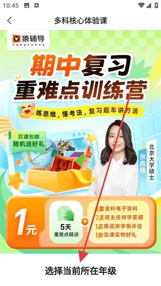 3、進(jìn)入多科核心體驗(yàn)課頁面,能看到期中復(fù)習(xí)重難點(diǎn)訓(xùn)練營(yíng)等課程展示,選擇當(dāng)前所在年級(jí),以便匹配適合的課程內(nèi)容。