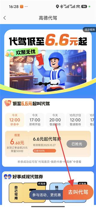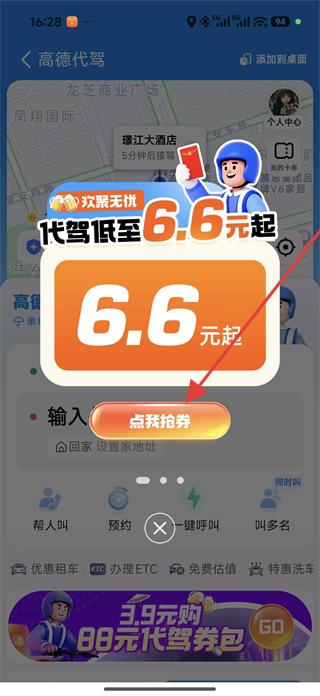 2、在高德代駕頁面看到代駕低至6.6元起的優(yōu)惠提示,點擊點我搶券,參與搶券活動。
