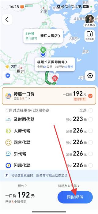 4、在代駕呼叫頁面選擇出發(fā)地和目的地,查看特惠一口價及各代駕服務商的預估價格后,點擊同時呼叫,發(fā)起代駕請求。